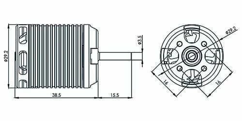 ●Input voltage:3S ●Max continuous current:46A/68A(5sec) ●Max output power:Approx. 500w/730W(5sec) ●KV value:3200KV ●Stator Dimension:2222 ●Stator Arms:9 ●Magnet Poles:6 ●Dimension:spindle 3.5×29.2x38mm ●Weight:Approx. 87g |