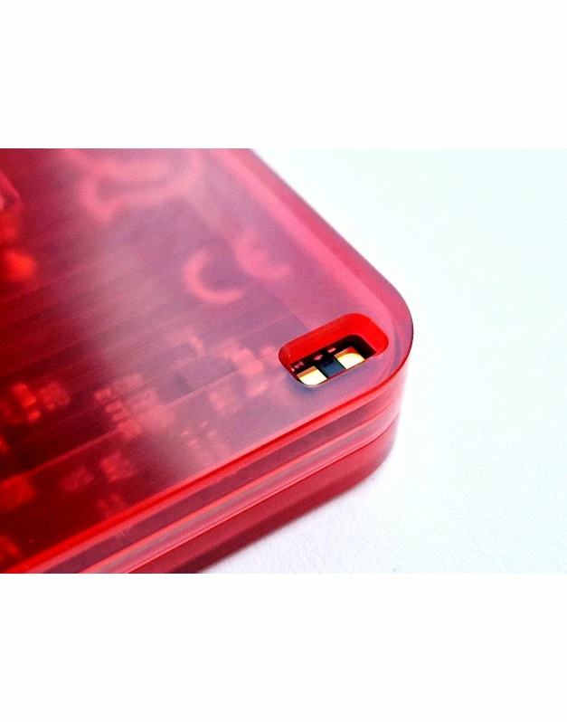 - Enclosure: High quality CNC milled, red, semi-transparent Plexiglas